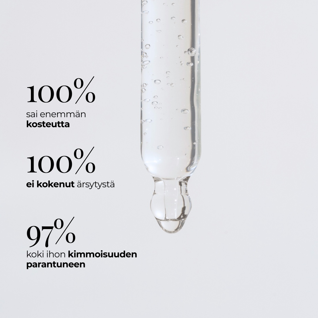 Jos olet epävarma tai olet aiemmin saanut reaktioita ihonhoitotuotteista, suosittelemme kokeilemaan seerumia ensin pienelle ihoalueelle. Levitä pieni määrä tuotetta käsivarren sisäpuolelle ja odota 24 tuntia – varmuuden vuoksi.
